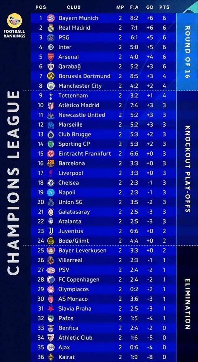 第2轮过后,25-26赛季欧冠联赛阶段积分榜更新,拜仁、皇马、巴黎、国米、阿森纳、卡拉巴赫同积6分位列前6,随后是积4分的多特、曼城和热刺!